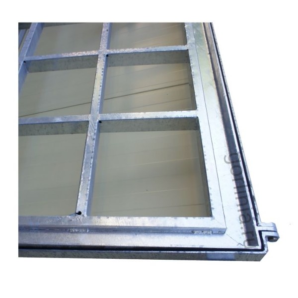 Рама сварена из сортового уголка 50х5. Каркас двери с внешним кантом выполнен с обвязкой из профиля 50х25 с ячейкой 300х300 в осях. Дно крышки закрыто оцинкованным листом 2 мм с расчетной глубиной 20 или 30 мм в зависимости от толщины доски декинга. Элемент петли реализован выносными разъемными шарнирами.