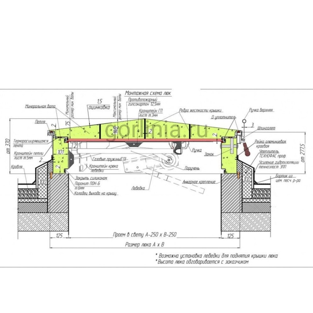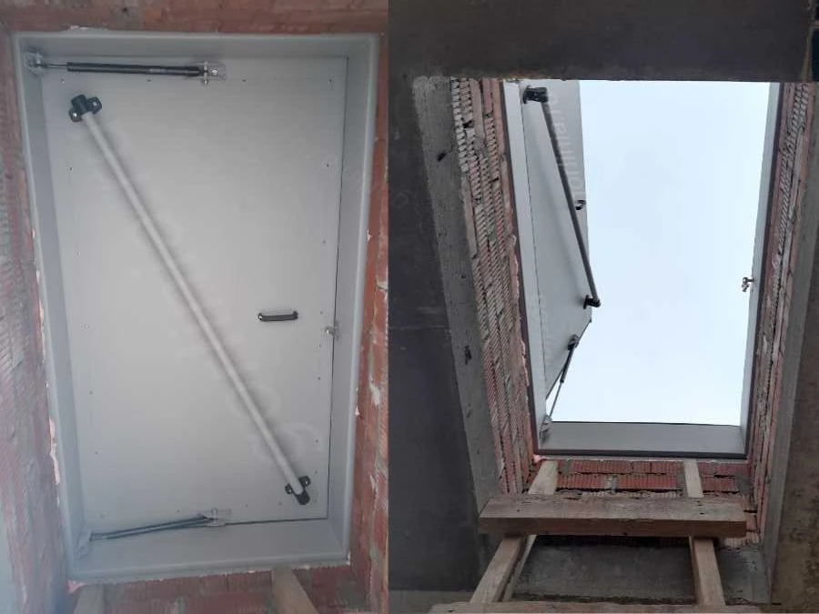 Подъемный механизм на шарнирных петлях с вспомогательными газовыми пружинами. Запирание створки на врезной замок с двухсторонней личинкой. Снаружи опорно-укрывной элемент может закрываться на задвижку во время нахождения на кровле.