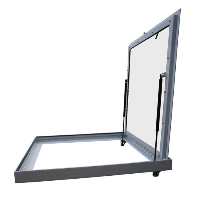 Установку выполнять в уровень чистовых полов в монтажный проем 800х800 с креплением анкерами по контуру в торцы плиты перекрытия (лаги каркаса) через отверстия в корпусе из уголка 75х75 или монтажные полосы нужной длины (дополнительная опция).